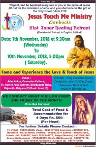 21st Inner Healing Retreat conducted by Jesus Touch Me Ministry 7.11.2018 – 10.11.2018