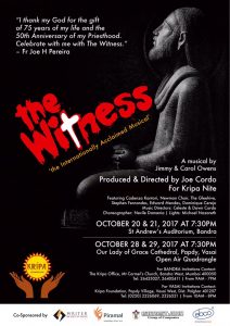 Kripa Foundation presents ‘The Witness’ – Internationally acclaimed Musical on 28 and 29 October 2017 at Papdy, Vasai Sep 26, 2017 By Admin DETAILS OF EVENT Dates: 28 & 29 October 2017 Time: 7.30 pm Venue: Our Lady of Grace Cathedral, Papdy, Vasai West (Open Air ...