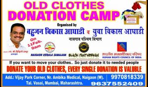 Old Clothes Donation Camp organized by Bahujan Vikas Aghadi and Yuva Vikas Aghadi at Naigaon West on 11.2.2018 Feb 10, 2018 By Admin Donate your old clothes to the needy at the Donation Camp at Naigaon West on 11February 2018 at Vijay ...