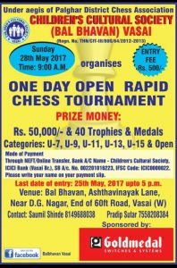 ‘One Day Open Rapid Chess Tournament 2017’ on 28 May 2017 at Vasai May 02, 2017 By Admin [fancy_heading title="DETAILS OF EVENT" h1="0" icon="icon-book-open" slogan="" style="icon" animate=""][/fancy_heading] Organised by Children's Cultural Society (Bal-Bhavan) Vasai Sponsored by Gold Medal Switches and ...