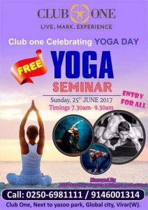 Club One is organizing a FREE YOGA Seminar on the occasion of Yoga Day on Sunday 25 June 2017 at Virar Jun 21, 2017 By Admin “Yoga teaches us to cure what need not be endured and endure what cannot be cured.” For more information :- Call ...