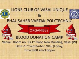 A Blood Donation Camp will be organized by Lion's Club Unique, Vasai, and Bhausaheb Vartak Polytechnic on 23 September ...