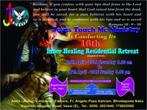 Inner Healing Residential Retreat – 14 to 17 April 2016 Apr 02, 2016 By Admin Experience the power and healing touch of Jesus at the 16th Inner Healing Residential Retreat conducted by Jesus Touch ...