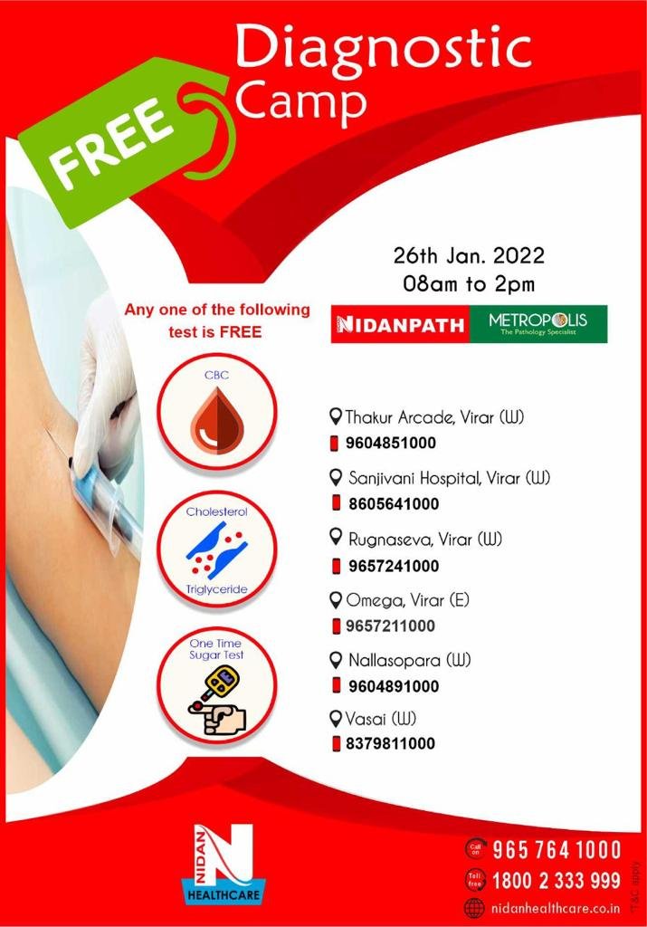Free Diagnostic Camp at Vasai-Virar organized by Nidanpath and Metropolis on 26 January 2022