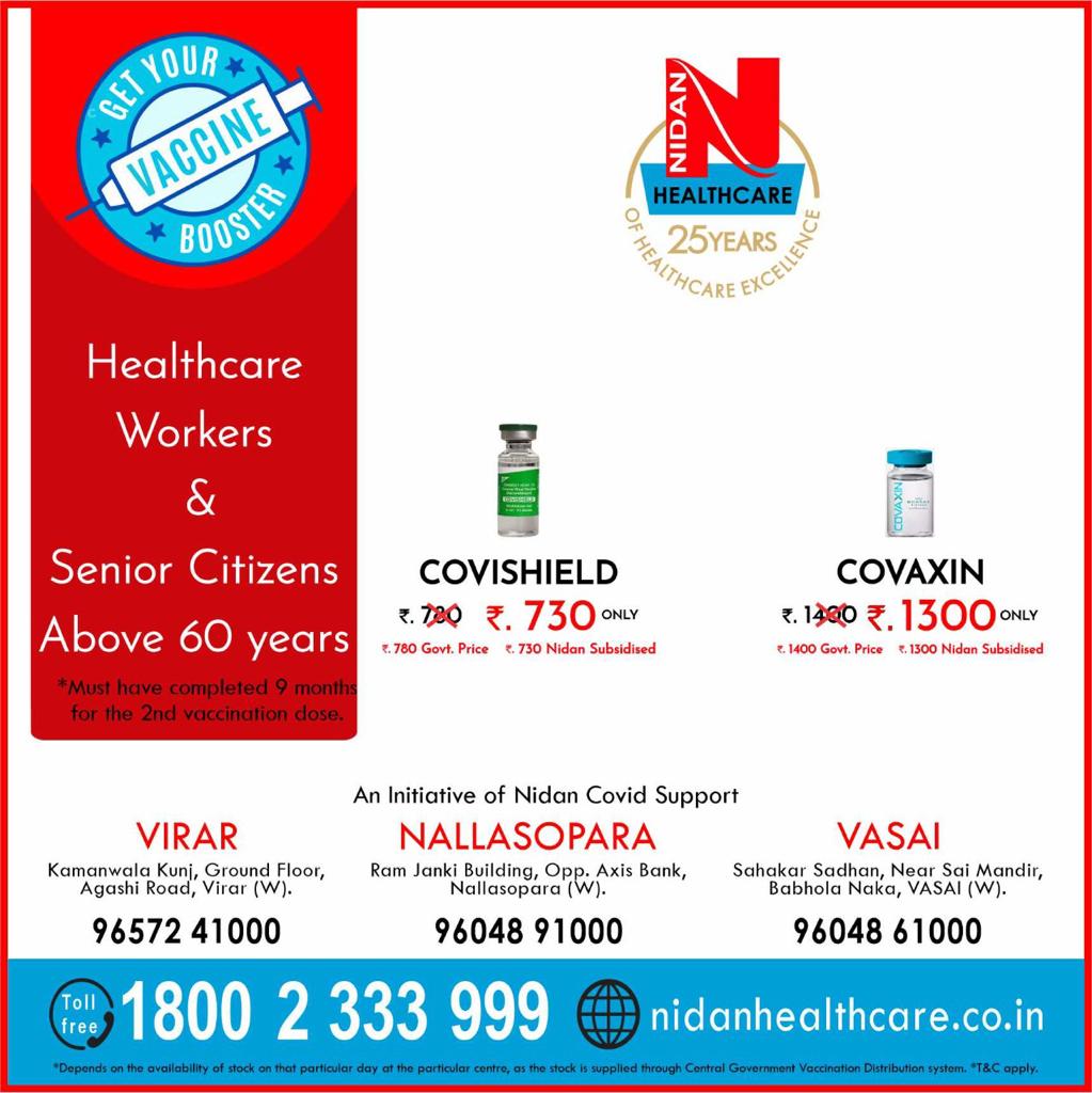 Nidan Healthcare has started with the booster vaccine for Healthcare Workers and Senior Citizens above 60 years of age. Booster dose of both COVISHIELD as well as COVAXIN are available at subsidized rates. An initiative of Nidan Covid Support.