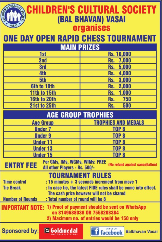 ‘One Day Open Rapid Chess Tournament 2017’ on 28 May 2017 at Vasai