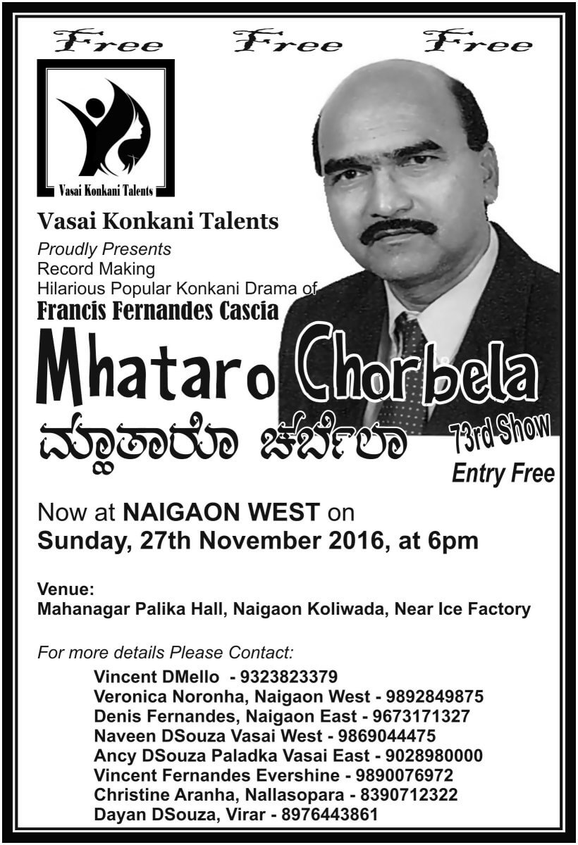 On Sunday, 27th November 2016 a hilarious and popular Konkani Drama ‘Mhataro Chorbela‘ will be presented by the Vasai Konkani Talents Group, at Naigaon West.