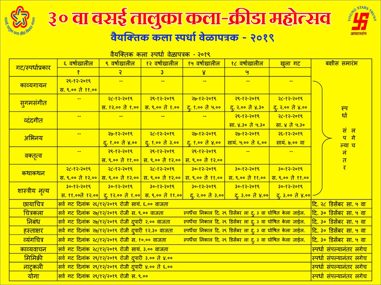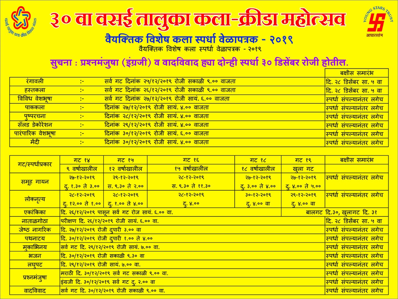 ३० व्या वसई तालुका कला क्रीडा महोत्सवाची प्रवेश अर्ज स्विकारण्याची मुदत वाढवीली असून ती शुक्रवार दिनांक १३ डिसेंबर २०१९ अशी राहिल